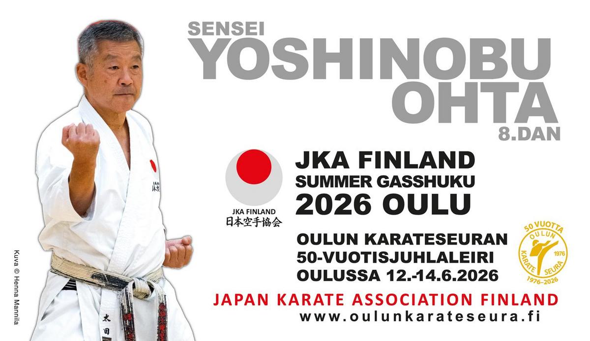 JKA Finland Summer Gasshuku 2026, joka on samalla Oulun Karateseuran 50-vuotisjuhlaleiri, pidetään Oulussa 12.–14.6. Leirin vetäjäksi saapuu JKA Englannin päävalmentaja Sensei Yoshinobu Ohta 8. Dan. Hän on erittäin taitava, kokenut ja haluttu leirien vetäjä maailmanlaajuisesti. Luvassa on tarkkaa opetusta, monipuolisia harjoituksia ja kovaa treeniä.
